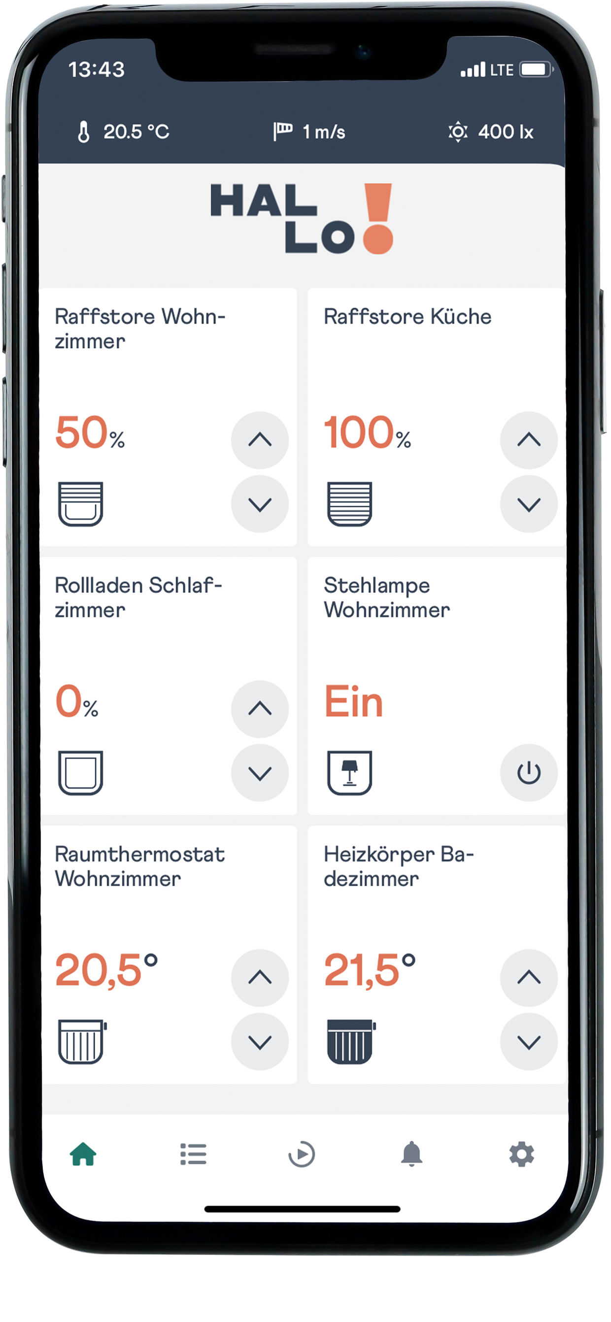 - Bewohner können ihren Sonnenschutz individuell per Knopfdruck oder direkt über die App regulieren. Hier lassen sich beispielsweise vorprogrammierte Uhrzeiten und Routinen festlegen.